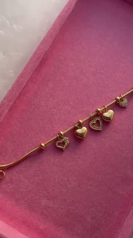A delicate gold-tone bracelet adorned with adorable heart charms for a soft, romantic look ✨